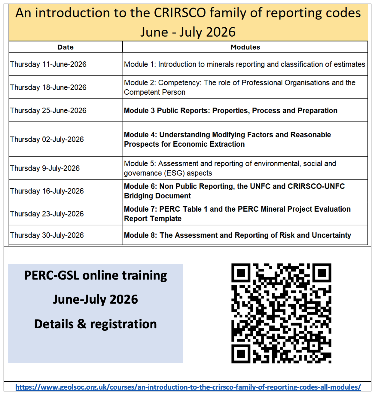 Registration: https://www.geolsoc.org.uk/courses/crirsco-module-7-perc-table-1-and-the-perc-mineral-project-evaluation-report-template/