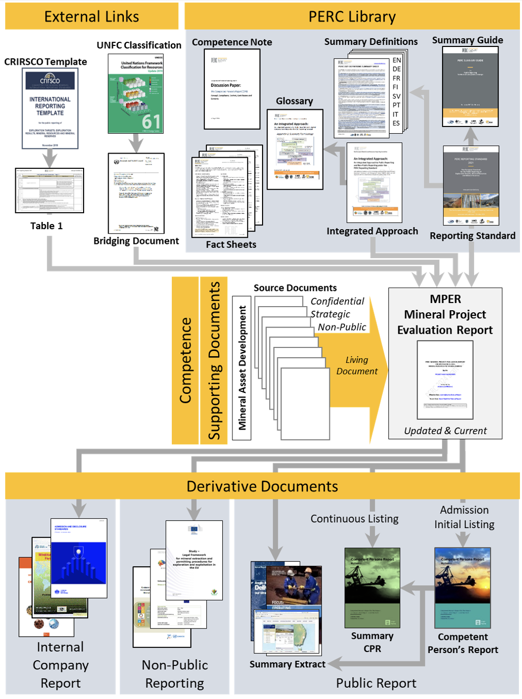 The PERC Library comprises a number of related documents that outline the philosophy for, and advocate industry-leading and best practice in, the systematic assessment, evaluation and reporting of Mineral Projects within the Minerals Industry. The PERC Library encompasses all aspects of Mineral Projects throughout the entire process of Mineral Asset Development, from initial concept and exploration, through the delineation and definition of Mineral Resources in development, to Mineral Reserves in Extraction Operations, and through to recycling and closure activities. The philosophy of the PERC Library is to provide Supporting Documentation for a consistent terminology, assessment and evaluation methods, and reporting practices that span internal company resource management, both public and non-public regulatory submissions, and public disclosures.