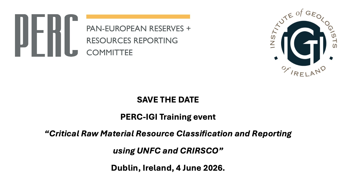 PERC and the IGI are pleased to announce that they are organising a one-day training event in Dublin on 4 June on the topic of “Critical Raw Material Resource Classification and Reporting using UNFC and CRIRSCO”.